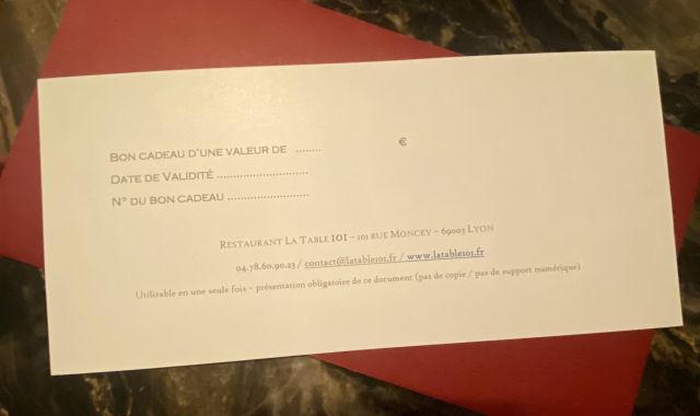 posté à l'adresse de votre choix en lettre suivie facturée 3.00 € dès réception du réglement (chèque à l'ordre de Restaurant La Table 101 ou virement bancaire SARL MAROLIDEL IBAN FR76 1382 5002 0008 0064 2223 407)